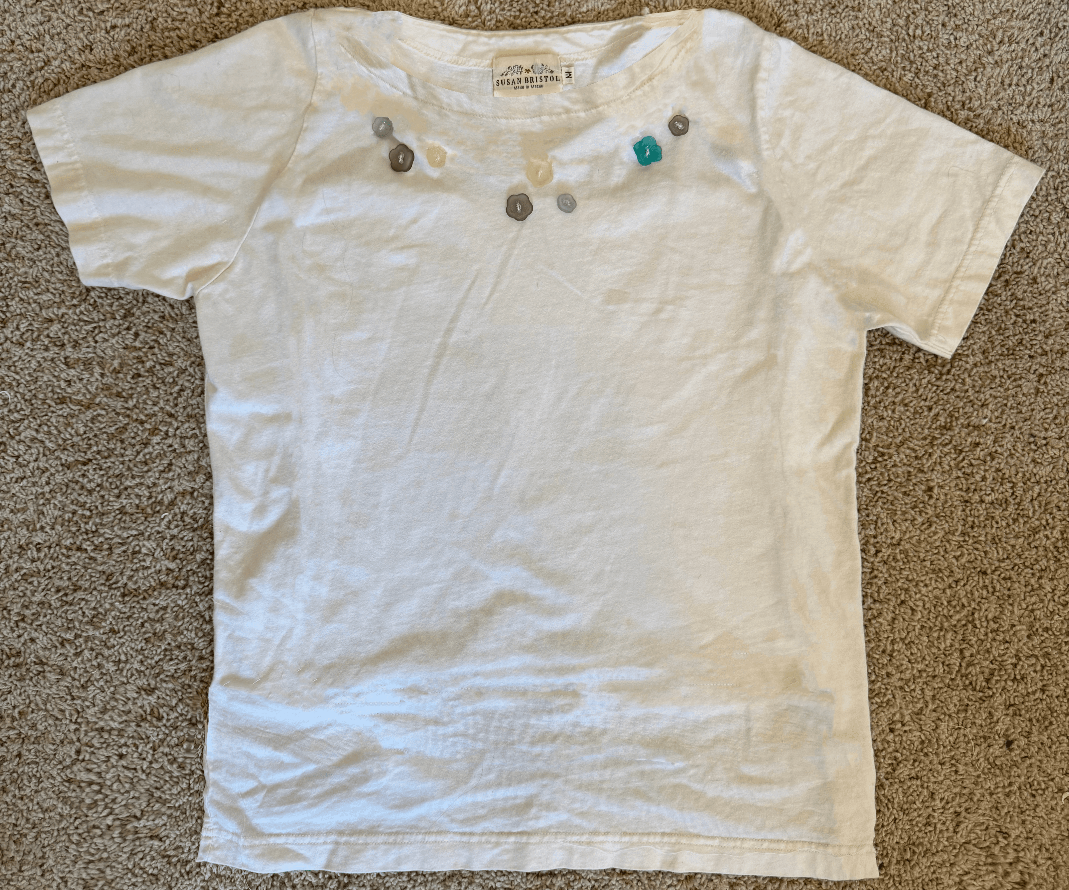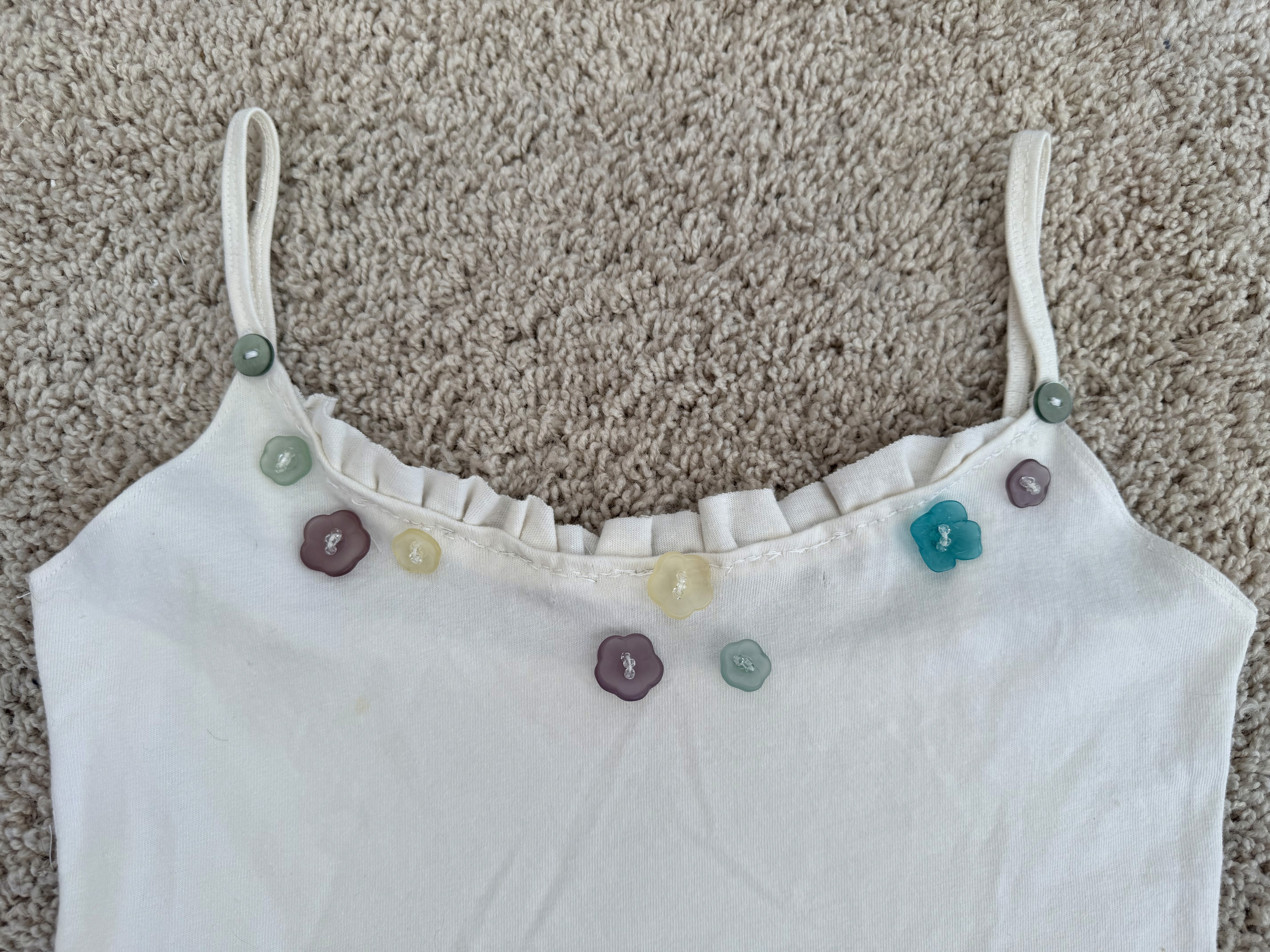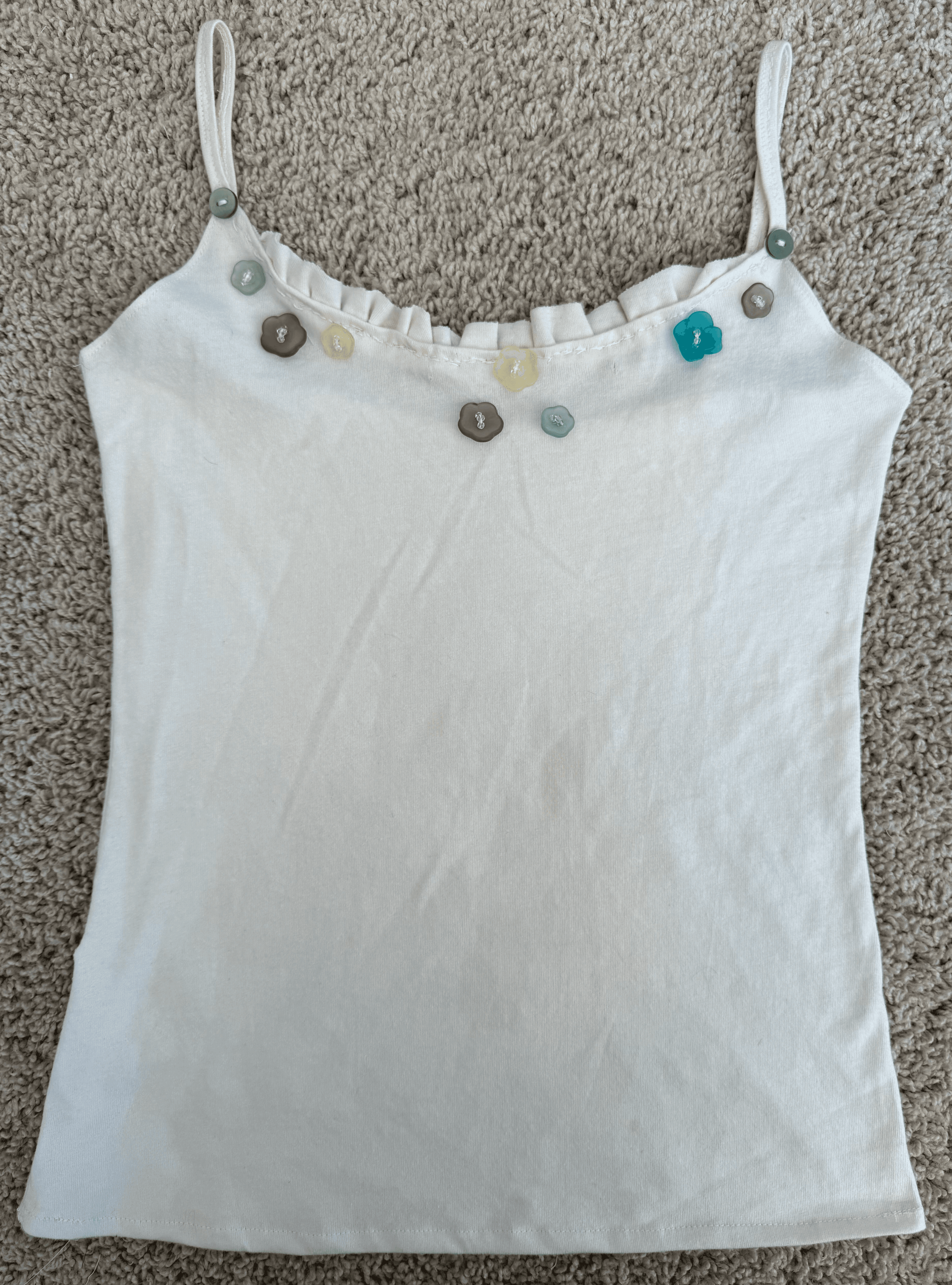 Pick a top without pre-beaded and stitched buttons. The placement of the buttons made it impossible to use my sewing machine to stitch the collar, so I had to do it by hand; that's why it looks so funky up there—I'm still learning hand-stitching patience. I thought about taking the buttons off and reattaching them later, but I really did not want to undo all of the beading inside the flowers.